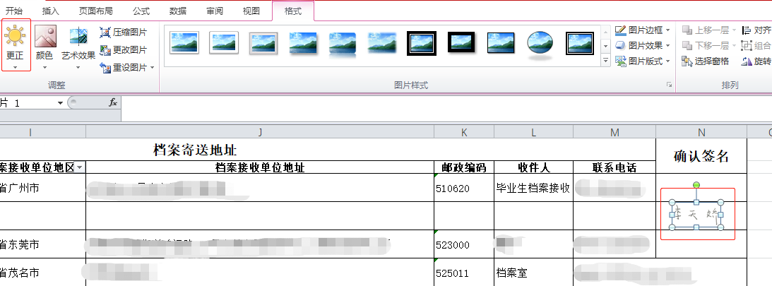 电子签名操作方法:在白纸上签名并拍照,裁剪为合适大小后,将图片插入表格签名位置,再点击“图片工具”-“格式”-“更正”-“亮度和对比度”,选择合适的亮度与对比度,完成后调整图片位置和大小,保持表格格式不变。