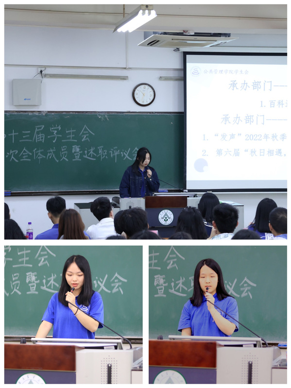 各部门负责人上台述职,对本学期各部门的工作进行回顾和总结,并明确了下学期工作计划,吸取经验,总结不足。负责人们用简洁的语言和直观的数据将上一学期颇丰的工作成果清晰地展现于全体成员面前,充实而又精彩。