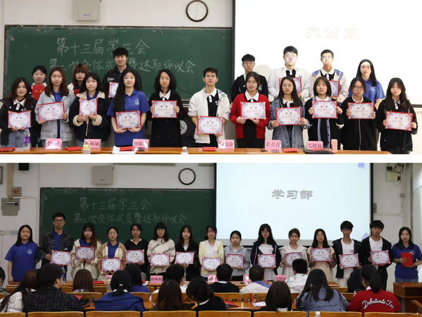 老师为部门负责人及主席团成员颁发聘书、各部负责人门给本部门工作人员颁发聘书并合影留念。大家的脸上都洋溢着笑容,这将是一份新的责任、新的担当,也是新的挑战、新的开始。