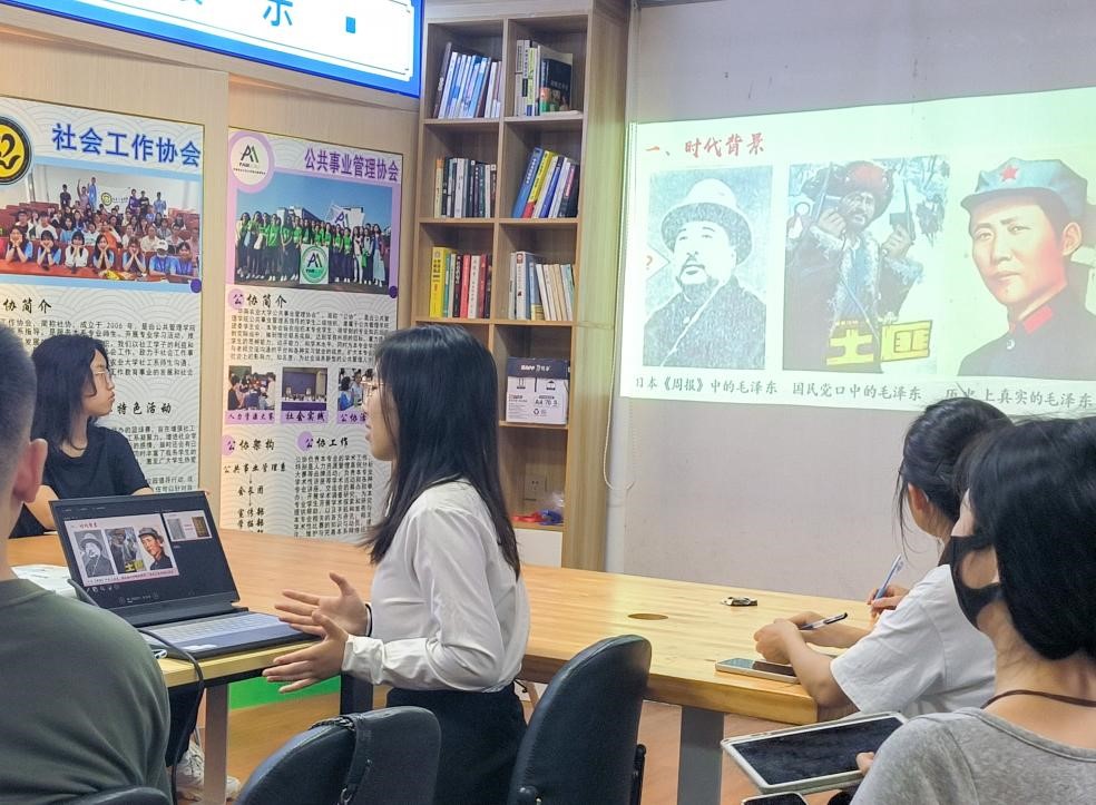 读书会伊始,社会工作专业本科生党支部代表邓蓉晏作为领学人,以日媒报道的一张毛泽东同志的照片开篇,引出当时的国内外形势——笼罩在白色恐怖和铜墙铁壁的新闻封锁下,中国共产党和红军的形象被蒙上了重重迷雾。斯诺正是在这样的背景下,冒着生命危险,冲破重重封锁,深入西方媒体眼中的“土匪聚集的地方”,通过四个多月的详实细致的实地考察,第一个向世界报道了红军长征的消息,让世界切实了解了“红色中国”。随后,邓蓉晏同志系统总结了书籍框架和大概内容,并播放了《红星照耀中国》电影节选及《山河岁月》纪录片相关片段,使党员们更加真切地感受作者眼中真实的“红色世界”。