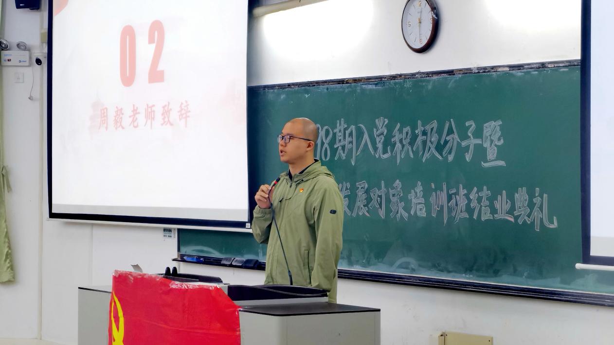 大会第二项,周毅老师致辞。周老师对学员们做出三点提醒:第一,在意识上认识到入党是一个持续的过程,时常对照党员的八项义务检视自己;第二,在行动上多作表率,做到知行合一;第三,加强身体锻炼,提高身体素质。