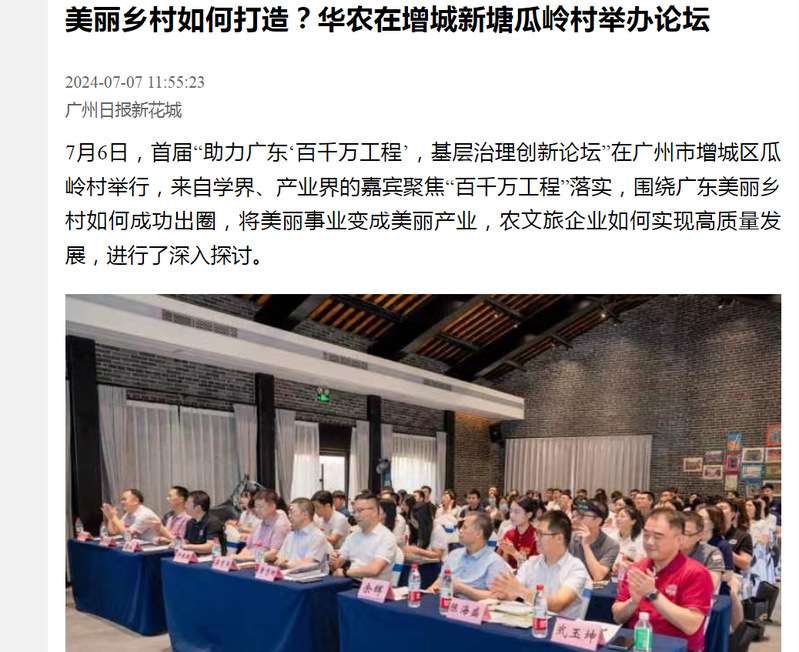 2024年7月6日,华南农业大学在广州市增城区瓜岭村举办首届“助力广东‘百千万工程’,基层治理创新论坛”。本次论坛由华农新利体育、增城瓜岭乡村振兴赋能中心主办。相关单位领导嘉宾、企业代表,以及华农2022级、2023级在读MPA学员等100余人参加。